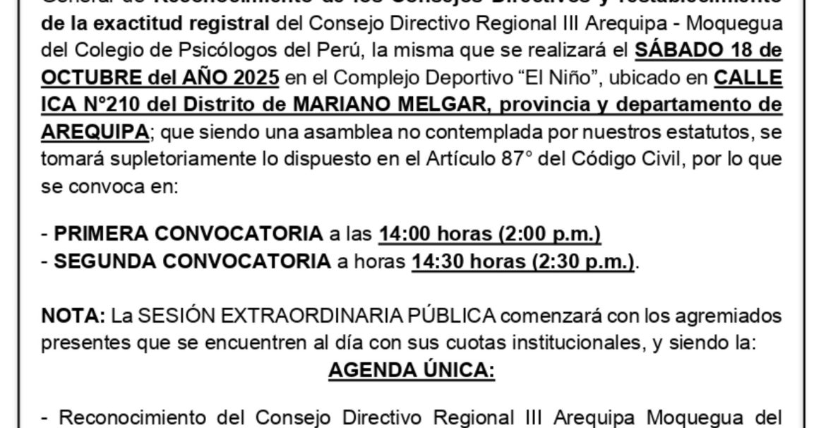 Día: Sábado 27 de setiembre Hora: Primera Citación: 14:30 horas (2:30 p.m.) Segunda Citación: 15:00 horas (3:00 p.m.) Lugar: Auditorio del