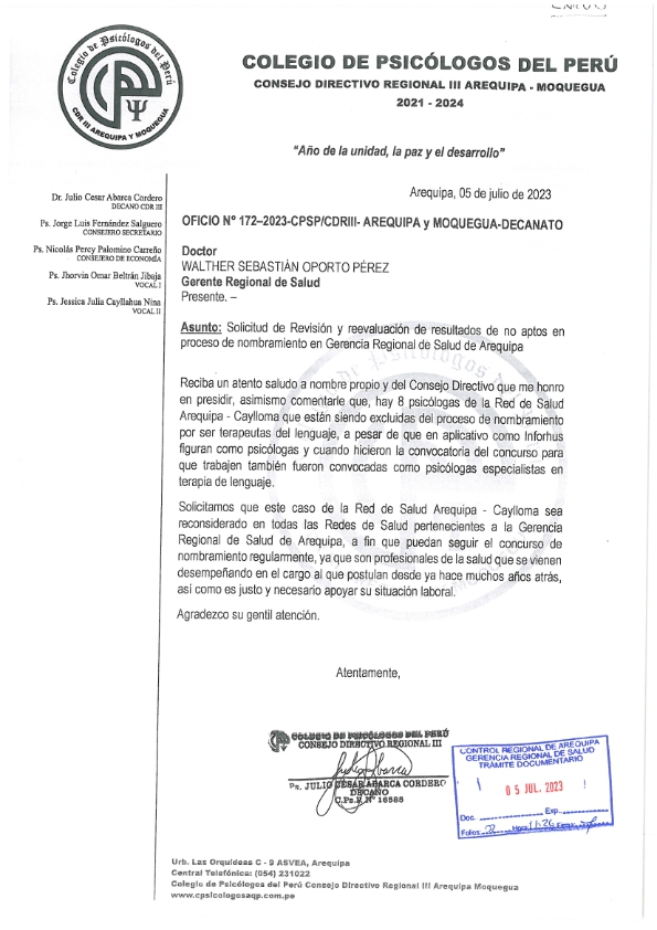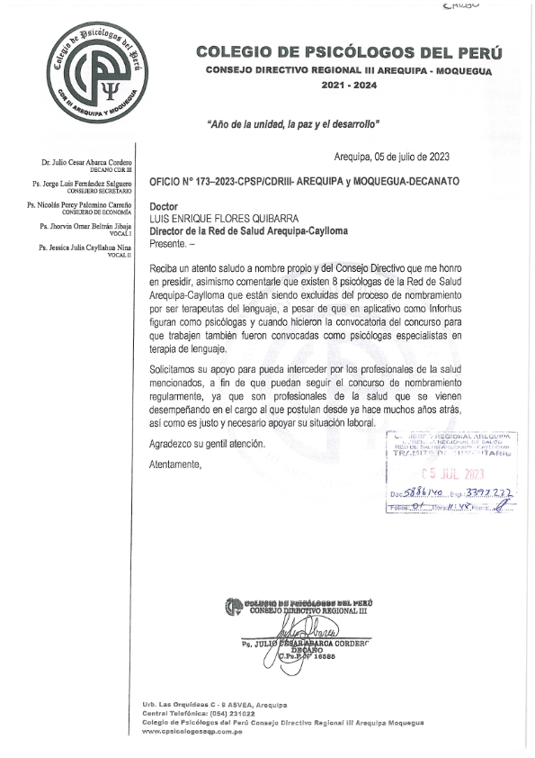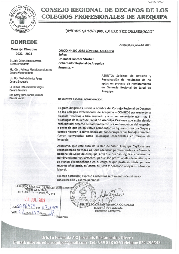 Decano del CDR III CPSP y Decano Presidente de CONREDE Arequipa, presento oficios para que postulantes en Proceso de Nombramiento 2023, puedan seguir su postulación sin problemas.