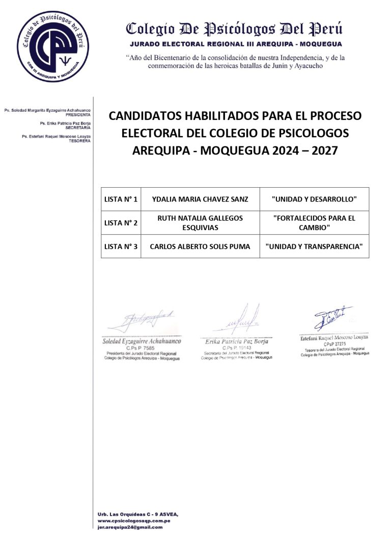 CANDIDATOS HABILITADOS PARA EL PROCESO ELECTORAL DEL COLEGIO DE PSICÓLOGOS AREQUIPA – MOQUEGUA 2024 – 2027