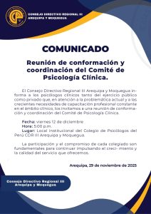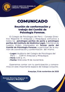 COMUNICADO PLANTÓN EN DEFENSA DE LOS DERECHOS DE LOS PSICÓLOGOS EDUCATIVOS. Agenda: Moquegua: Fecha: miércoles 26 de noviembre de 2025 Hora: 8:30 a. m. Lugar: Frontis del Gobierno Regional de Moquegua Arequipa: Fecha: jueves 27 de noviembre de 2025 Hora: 10:00 a. m. Lugar: Frontis del Gobierno Regional de Arequipa Se solicita que quienes participen