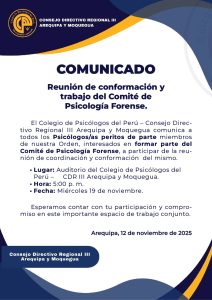📢 COMUNICADOReunión de conformación y trabajo del Comité de Psicología Forense.Miércoles 19 de noviembre, 5:00 p.m.Interesados en participar, inscribirse en el siguiente enlace:👉 https://forms.gle/rdK9BkaP3bot8pqk7