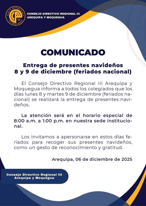 Entrega de presentes navideños 8 y 9 de diciembre diciembre 6, 2025 InicioCOMUNICADOSEntrega de presentes navideños 8 y 9 de diciembre Entrega de presentes navideños 8 y 9 de diciembre (feriados nacional)