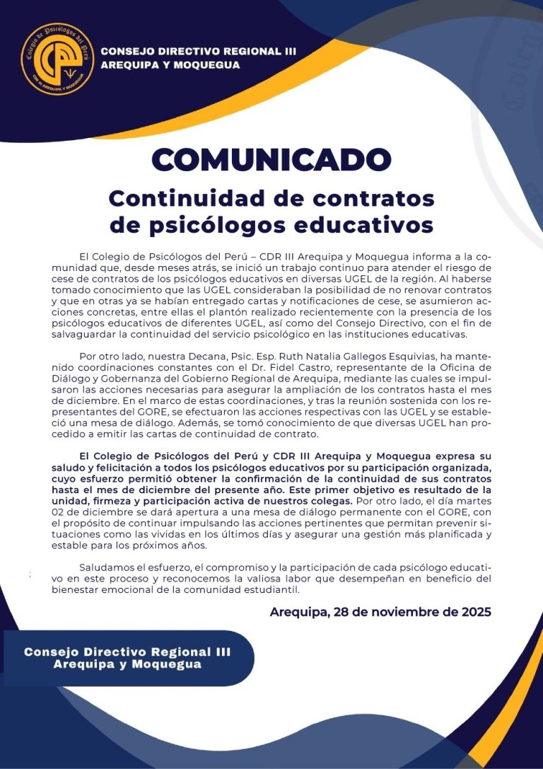 COMUNICADO: Continuidad de contratos de psicólogos educativos hasta hasta el mes de diciembre 2025