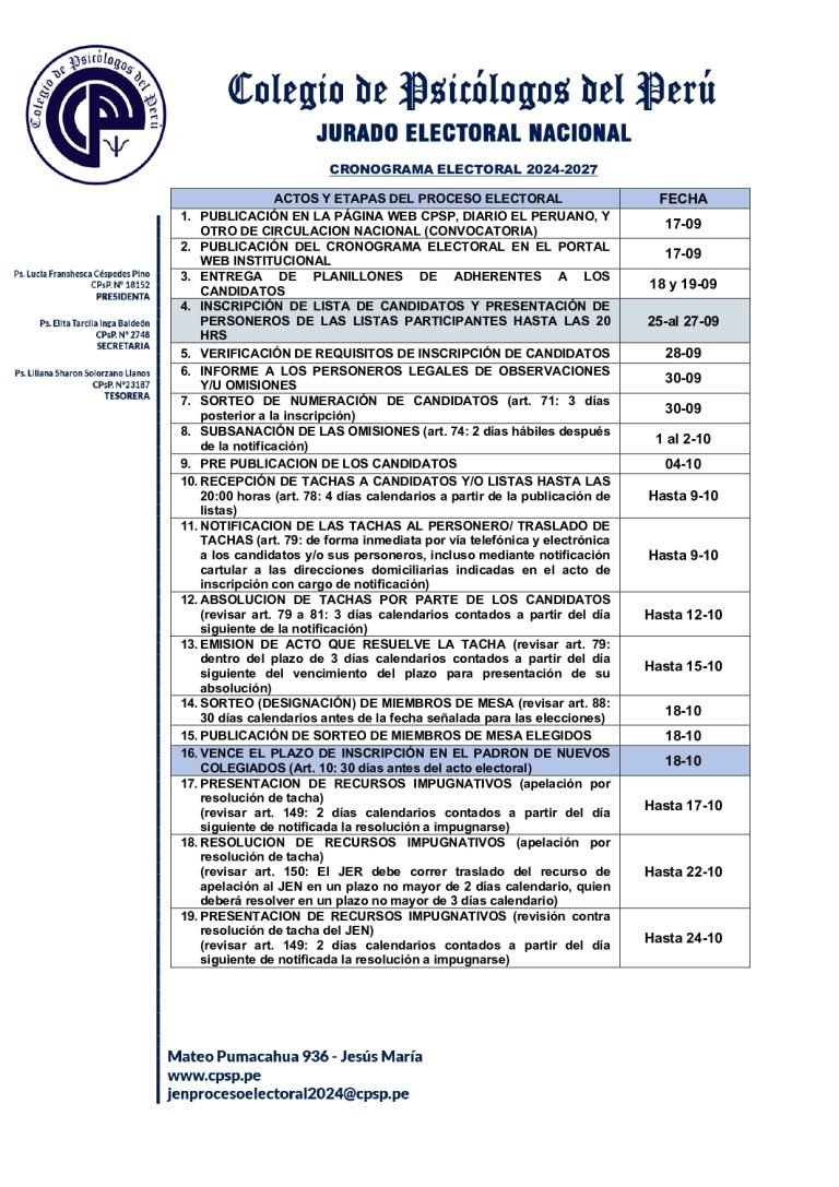 Cronograma Electoral 2024 – 2027 octubre 19, 2024 InicioCOMUNICADOSCronograma Electoral 2024 – 2027 A pedido del Jurado Electoral Regional publicamos, para recordarles, el cronograma del electoral del CDN y CDR III 2024-2027