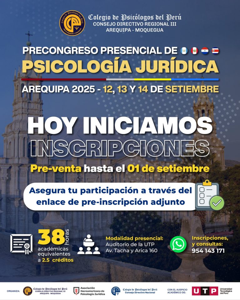 Organiza: Colegio de Psicólogos del Perú – CDR III Arequipa Moquegua, Asociación Iberoamericana de Psicología Jurídica y el Consejo Directivo Nacional.