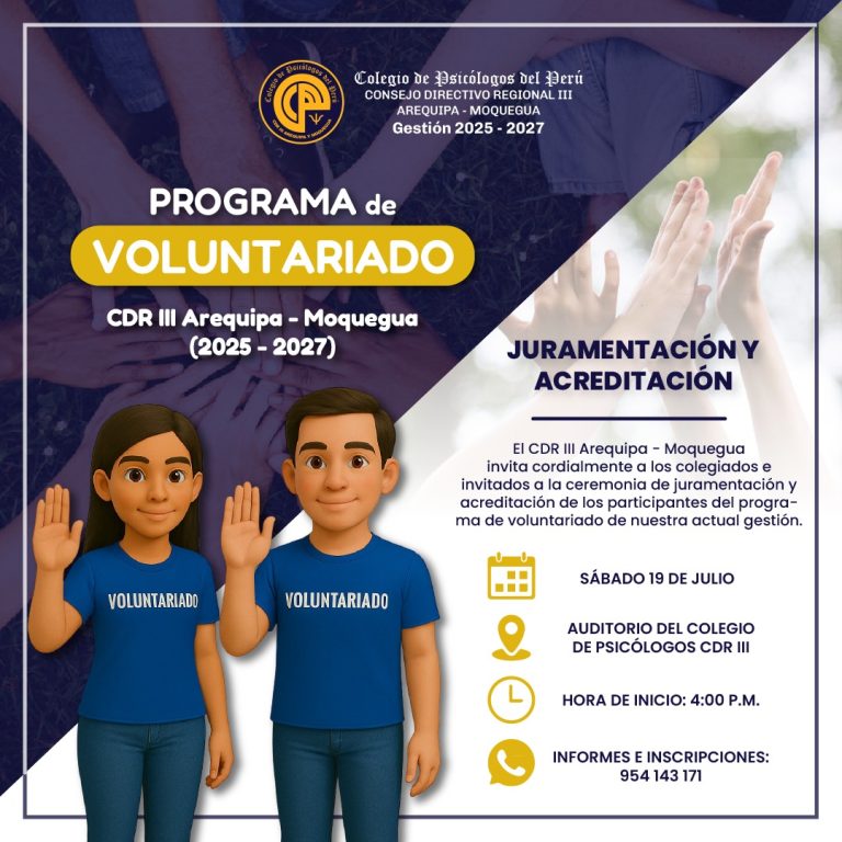 El CDR III Arequipa – Moquegua invita a todos los colegiados e invitadas/os a la ceremonia de juramentación y acreditación de los participantes del Programa de Voluntariado 2025 – 2027.
