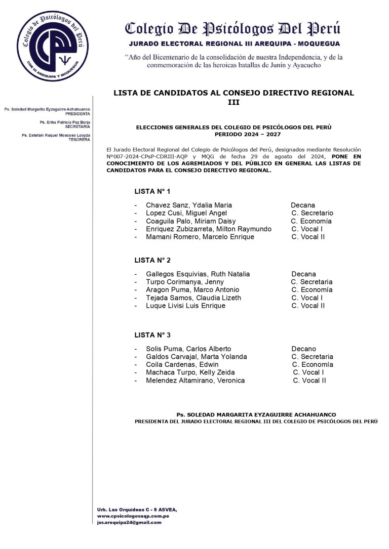 Listas de los Candidatos al Consejo Directivo Regional III Arequipa y Moquegua