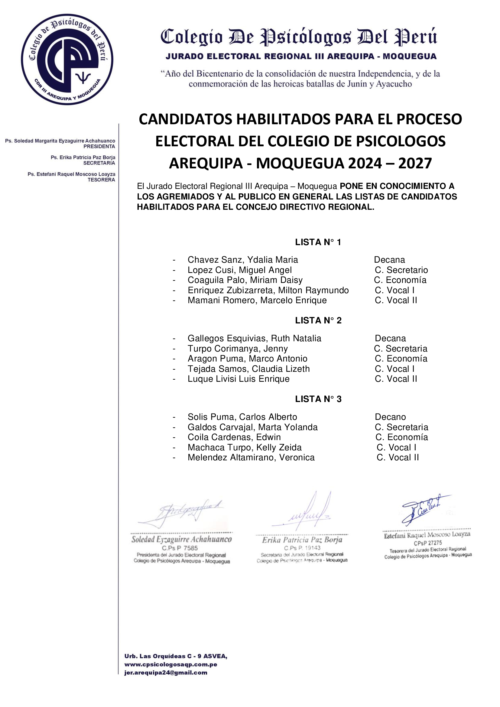 Listas de Candidatos Habilitados para el proceso electoral del Colegio de Psicólogos – Arequipa y Moquegua 2024 – 2027