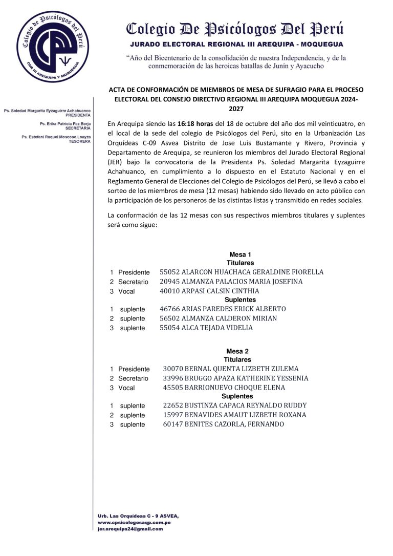 Miembros de mesa para el proceso electoral del CONSEJO DIRECTIVO REGIONAL III AREQUIPA MOQUEGUA 2024-2027ACTA DE octubre 18, 2024 InicioCOMUNICADOSMiembros de mesa para el proceso electoral del CONSEJO DIRECTIVO REGIONAL III AREQUIPA MOQUEGUA 2024-2027ACTA DE